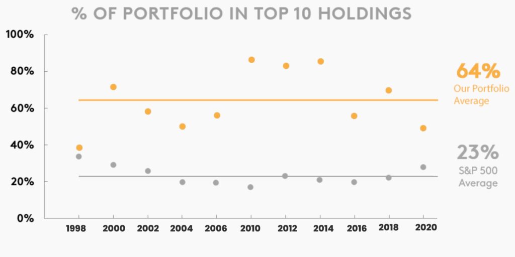 We look up to the exceptional businesses, those that carve out their own space in the market or control a specific subset of that industry, those that stand head and shoulders above their competitors. Excellent companies typically command a high price per share on the stock market. We wait for the infrequent times when they may be bought at a discount to their underlying values that includes a margin of safety, which we consider the single most essential idea in investing, and then we make the most of those opportunities. Our modest portfolio isn’t representative of the S&P 500 or any other benchmark. In fact, more than 60% of our portfolio value is typically derived from our top ten holdings. While the S&P 500 may be useful for gauging our long-term success, it has no influence on the decisions we make when putting together individual portfolios.